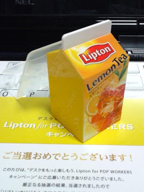 500mlの紙パックのリプトンに貼ってあるシールにシリアルナンバーが書いてあって、それを入力すると抽選開始。5000名にスマホスタンドが、3ポイント貯めて応募すれば2000名にUSB扇風機が当たる、というキャンペーン。