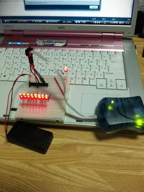 その動画で紹介されているAVR Studioはバージョンが4なのですが、最新は5なので 5をインストール。6のβ版もあったけど。4と5ではプロジェクトを作るところから、マイコンにライトするところまで いろいろ違うところがあって、多少迷いつつも ついにライトが成功! 写真のように8つのLEDが光りました。