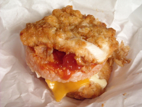 以前にはライスではなくて、ベーコンを挟んだ「チキンフィレダブル」が発売されていました(自分の日記見返したら、ちょうど1年前のことでした)。あれは本当に"お肉だけ"って感じでしたから、ビスケットを一緒に注文して、交互に食べるのがちょうどいい、てか単体ではしょっぱい感じでした。今回はライスが挟んであるので、塩っ気が単体でもちょうどよくなっていると思いました。