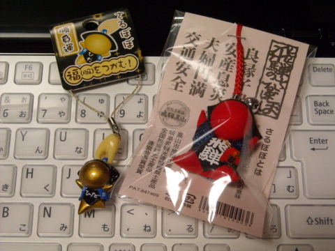 ストレートに赤いさるぼぼのストラップと、福をつかむ=服をつかむに引っかけた金色のさるぼぼのストラップを買いました。さるぼぼの色によって効力が異なるそうで、おまじないグッズにありがちな分かりやすいルールなんですが、赤は交通安全・家内安全、金は金運・くじ運に効果があるそうですよ。さるぼぼがつままれている感じが、カービィがマスターハンドにつままれている感じと似ていてかわいい。