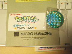 サイン会のときにもらった缶バッチと同じなんじゃないかと思ったら、違うデザインでした。カラープリントで ネギで照準を定めているちびミクさんに対して、届いたバッチは腕を振り上げたポーズのシルエット。