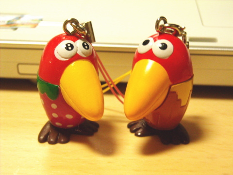 同時に「キョロちゃんストラップ プレゼント」も実施してました。対象商品を2つ買うと、キョロちゃんのストラップを1つもらえちゃいます。これはすでにどののお店を探しても残ってなくて、終わってるかも。ピーナッツといちごの2種類があって、両方ゲットしました。でも、なぜかいちごキョロちゃんの出来が悪い。触るとベタベタして塗装が乾いてない感じで薬品臭いし、目の塗りがはみ出してる。