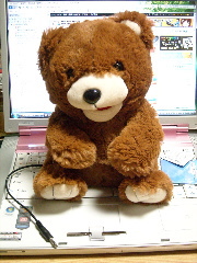 そのあと、UFOキャッチャーをチェックしていたら、100円で1回、200円で3回プレイできるというボーナス設定のUFOキャッチャーを発見。200円入れて挑戦して2度目が失敗したところで、店員さん登場。突然失礼しまーすって景品を取りやすく いじってくれて、3度目でゲット。で、ゲットしたのがこのクマのぬいぐるみです。