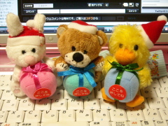 もうクリスマスなんだね。このぬいぐるみ、プレゼントのところに「押してね」とシールが貼ってあって、押すとジングルベルのメロディーが流れます。3匹とのメロディーは同じ。やっぱ、ウィッツィーが好き。黄色い毛玉感。