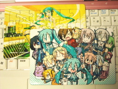 そして完成したパズルがこの写真のものになります。みなみさんの「ちびミクさん三周年」とredjuiceさんの「イエロー」を使わせていただきました。パッと見は なかなかいい感じですが、実際は 色のムラが結構ひどかったりします。ちびミクさんのほうは 縦線のたくさん入ってるし、イエローのほうは ぼやけているし。けど、300円で簡単にパズルが作れちゃうなら十分かな。表面は光沢があってきれいです。写真の画像のほうがきれいに仕上がるのかな。
