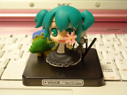 このVOiCEのフィギュアは、ニコニコ動画に上がっているPVバージョンのほうをモチーフに作られています。原曲のオリジナル動画はイラストのみですが、それに3DのPVをつけたバージョンが作られて、その世界観がフィギュアになっています。ちゃんと後ろにはあのロボットも。