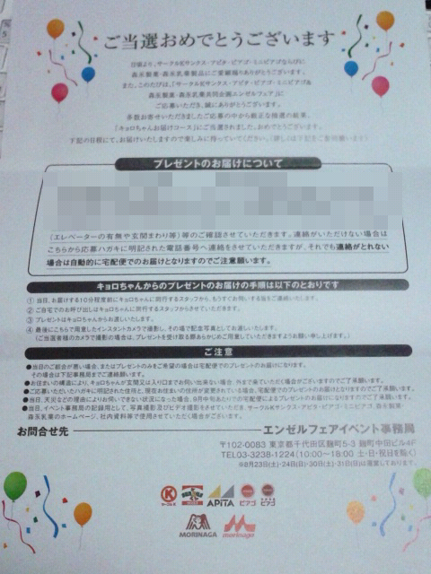 で、問題はここから。なんとキョロちゃんご本人が直々に缶詰を届けに来てくれるよ!という内容の手紙がまず届いたのです。家にご招待できるスペースもないし、(ぶっちゃけきぐるみからおもちゃもらってるような年でもないし)後日お断りして缶詰だけ発送してもらうことにしました。