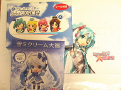 買ってきたのは「雪ミクリーム大福(マウスパッド付き)」「トリコロール・エア・ライン ふんわりお菓子(シール付き)」「ミクの日大感謝祭 オフィシャルパンフレット」。あとガチャポンを3回やりました。ノーマルリンちゃんとCAリンちゃん、MEIKOが出てきました。予期せず、感謝祭のパンフレットをゲットできちゃったのがうれしい!