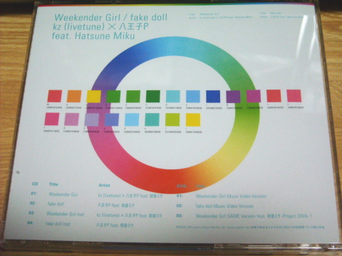 DVDには、わかむらPが手がけた「WeekenderGirl」と「fake doll」のPV、そしてDIVA fのPVが収録されています。もちろん曲が素敵なのですけど、これはDVDでPVを見ないともったいないですよ。エビ反りで超跳躍力を見せるミクさん、エレクトリックなエフェクトを華麗に使いこなすミクさん、あざとい、あざといよぅ