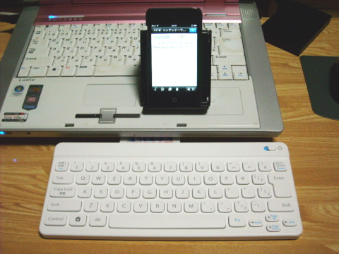 まずは「ニンテンドーワイヤレスキーボード」をiPod touchに接続して使うこと。「バトル&ゲット! ポケモンタイピングDS」に同梱されている「ニンテンドーワイヤレスキーボード」は、Bluetooth接続に対応していて、iPod touchでBluetoothをONにすれば接続できる・・・はずだったのですが、2Gではなぜか接続できず。この4Gで接続できるか再挑戦してみました。結果は○! 4Gなら接続可能なことを確認できました。