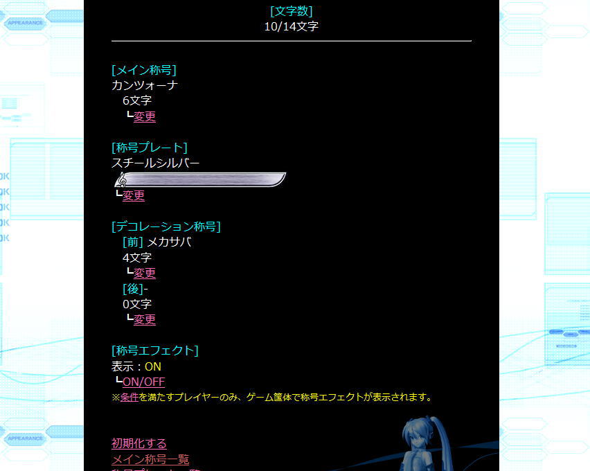 Rev.4では、ボタン音の追加・音量調整などなど、細かい設定がいろいろ充実するようです。でも事前によくチェックしてなかったので、とくに新しい機能をいじることもなく、普通にプレイして終了。ちゃんとDIVA.NETのページはRev.4向けに称号の設定をいじれるように更新されてます。