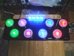 中央にステンドグラス的なオブジェを付けてみました。アクリル板の表面を削っておくと、横から差し込んできたLEDの光によって 浮かび上がるように見えるというものです。DIVAのロゴとSEGAのロゴを作ってみました。おまけのつもりでやったのに、意外と見栄えが良くて、作ってよかった。