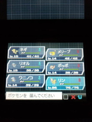 ここで助っ人の投入です。クリア済みのブラック1から、タマゴ技で「ブレイブバード」を覚えたポッポ、秘伝マシンで「なみのり」「たきのぼり」を習得済みのワニノコ、「リン」と名付けた♀のキリンリキ、この3匹をポケモン交換で連れて来ました。