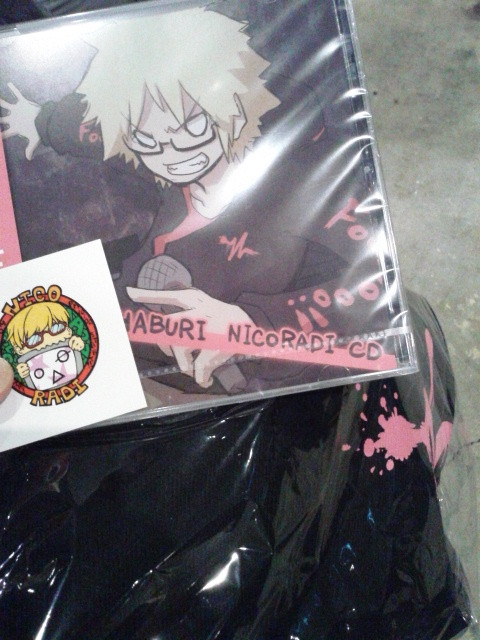 入場してまもなく、直行したのはニコラジの物販ブース。数量限定のニコラジジャンキーパーカー略して「ニコラジジャンパー」と、「無茶ぶりニコラジCD」が販売されるからです。場所がボーマスエリアなので、走らず早歩きで 入口から1番遠い場所まで移動。着いたときにはやっぱり数名の人が列をつくってました。そして無事購入することに成功! ニコラジステッカーももらっちゃいました。前回の口笛CDとやまださんの本もフルコンボで買えば、やまださんの顔がプリントされたビスコ「ヒサシ」がもらえたんですけどねぇ。