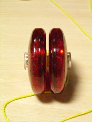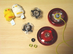 気を取り直してハイパークラスター。なかなかおもしろい構造です。言葉では説明が難しいのですが、小さい歯車の噛み合わせによって、ヨーヨーのボディを固定しています。コア部分のバネを押し込むことで歯車の噛み合わせを解除して分解できるようになっていて、その構造上、ヨーヨーの重量が重くなってしまうようです。軸部分が重いと 重心が中心になってしまうので、バランス的にはいまいちなんですけど、改善の余地はアルだろうか?