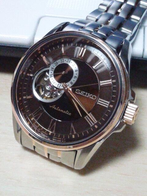 買ったのは、セイコーのプレザージュというブランドのブラウン色の時計。自動巻き・手巻き両方付いてて、24時針も付いてます。文字盤のてんぷの部分に窓が付いているので、時計を身に着けたままその動きが見れるのが気に入って選びました。メイドインジャパン!