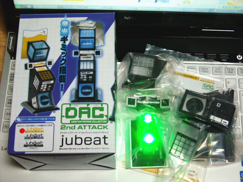「デスクトップアーケードコレクション 2nd ATTACK jubeat」というフィギュア。コナミの音楽ゲーム「jubeat」を1/12サイズで再現したフィギュアです。「jubeat knit」「jubeat copious」「jubeat saucer」の3種類ありまして、全種類セットを注文して買いました。本来ならゲームセンターのUFOキャッチャーでゲットするものなんですけど、確実に欲しくてUFOキャッチャーで元を取れる気がしなかったので…