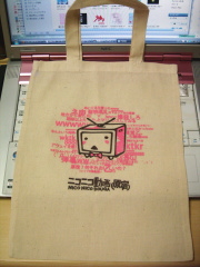 「先着500名様にオリジナルグッズをプレゼント」というのが「行こう!」と決めた1番の理由だったわけですが、ニコニコショップでは先着500名にオリジナルトートバッグがプレゼントされました。ショップでグッズを買うと、いっしょにもらえる流れです。カフェのほうではオリジナルTシャツももらえたそうですが、さっき言ったようにそっちは行ってないのでもらってません。小さい写真では、テレビちゃんが桜のはなびらのまいを食らっているように見えますが、いろんなピンク色のコメントに囲まれてます。