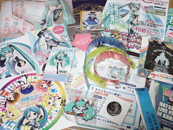 「マジ」はコンサート会場、「カル」はギャラリー&ワークショップ、「ミライ」はグッズ販売&企業ブースになっていまして、「カル」と「ミライ」だけまわれるチケットなら500円で楽しめます。3時くらいのツイッターのタイムラインで すでに完売の情報がガンガン流れてくるので、行ったときには何も残ってないんじゃないかと心配でした。手に入れたものをばらまくとこんな感じ。